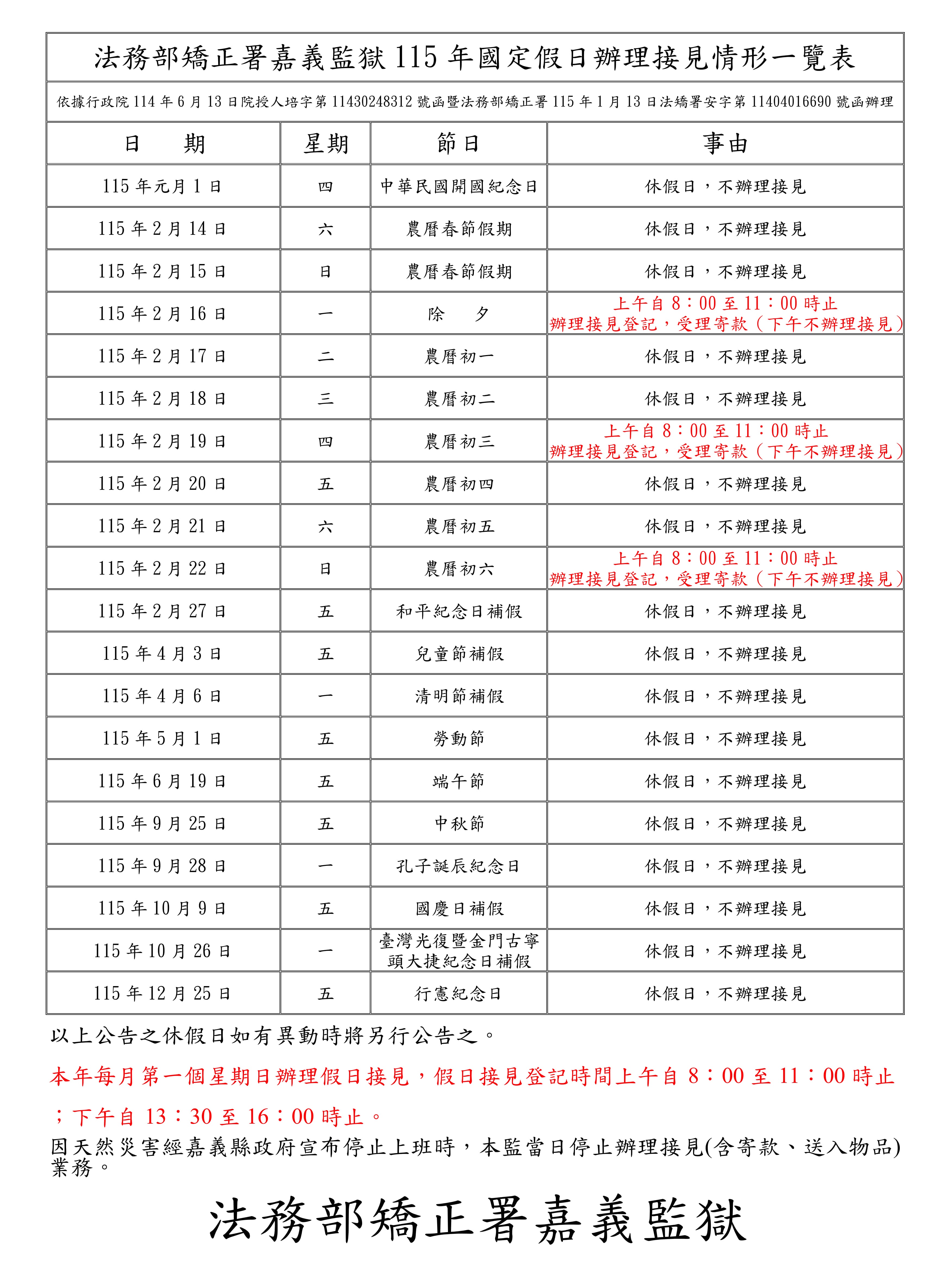 法務部矯正署嘉義監獄 115年國定假日辦理接見情形一覽表
